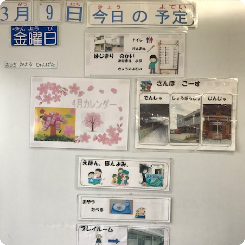 その日のプログラムや目標はホワイトボードに。視覚支援の一環です。